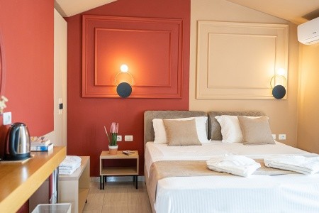 • skládá se ze 2 dvoulůžkových pokojů bez spojovacích dveří • klimatizace: v ceně, individuálně řízená • lednička • rychlovarná konvice • Wi-Fi • TV • vana nebo sprcha • WC • vysoušeč vlasů • balkon nebo terasa |