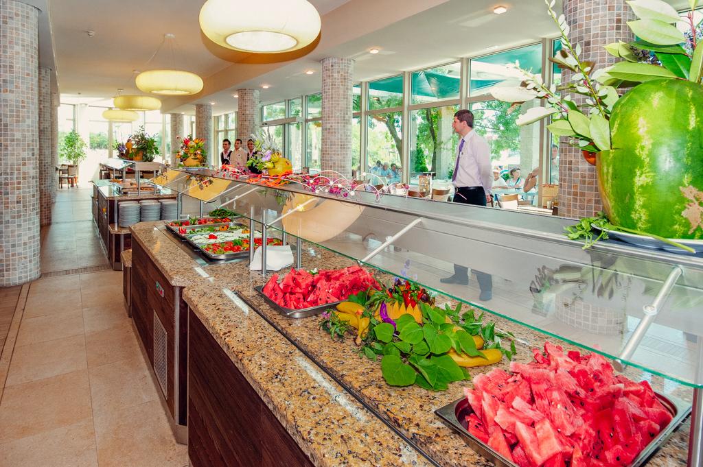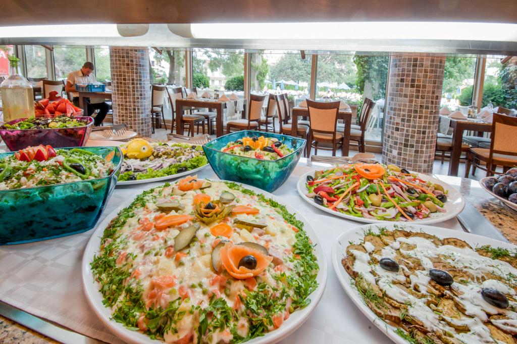 | Služby all inclusive zahrnují plnou penzi formou bufetu (snídaně v době od 07:30 do 10:00 h, obědy v době od 12:00 do 14:00 h, večeře v době od 18:00 do 21:00 h), dopolední a odpolední občerstvení, pozdní odpolední občerstvení (káva, čaj, zákusky), neomezenou konzumaci vybraných místních alkoholických (destiláty obvykle podávané v míře 50 ml) a nealkoholických nápojů v barech a restauraci v době od 09:00 do 23:00 h. Uvedené časy jsou orientační. |