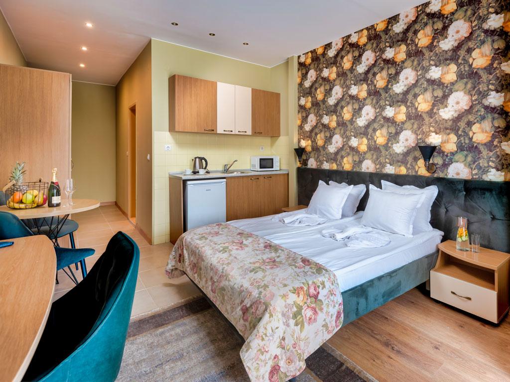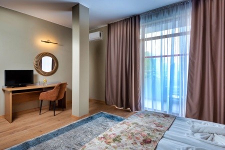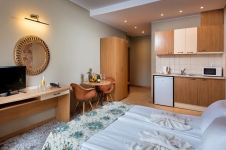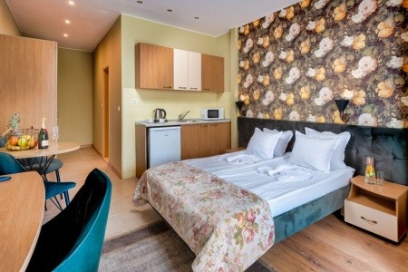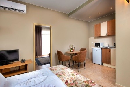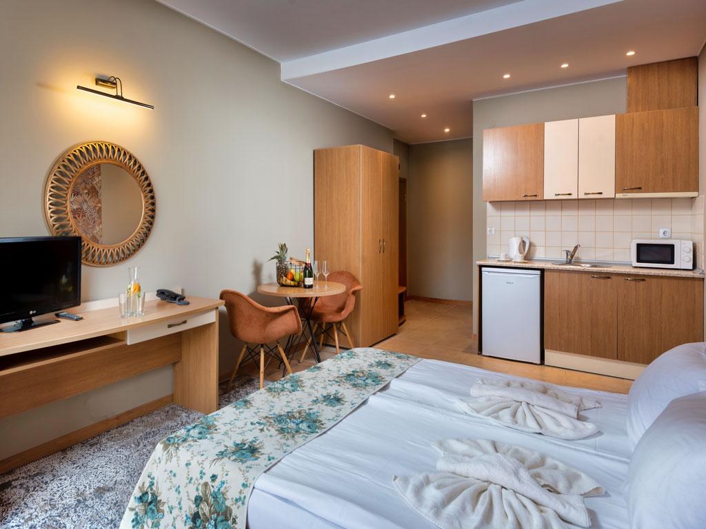 | Pokoje s balkonem a sociálním zařízením (vana nebo sprcha, WC, fén) jsou klimatizovány (klimatizace zdarma) a vybaveny TV/SAT, telefonem, Wi-Fi (zdarma) a kuchyňským koutem. Možnost jedné přistýlky. Maximální obsazenost dva dospělí a jedno dítě. Jsou zde k dispozici i apartmány A 2+2 (ložnice a denní místnost se dvěma lůžky a kuchyňským koutem, maximální obsazenost čtyři dospělí). Kuchyňský kout je vybaven chladničkou, mikrovlnnou troubou, rychlovarnou konvici a kuchyňskou linkou se základním vybavením. |