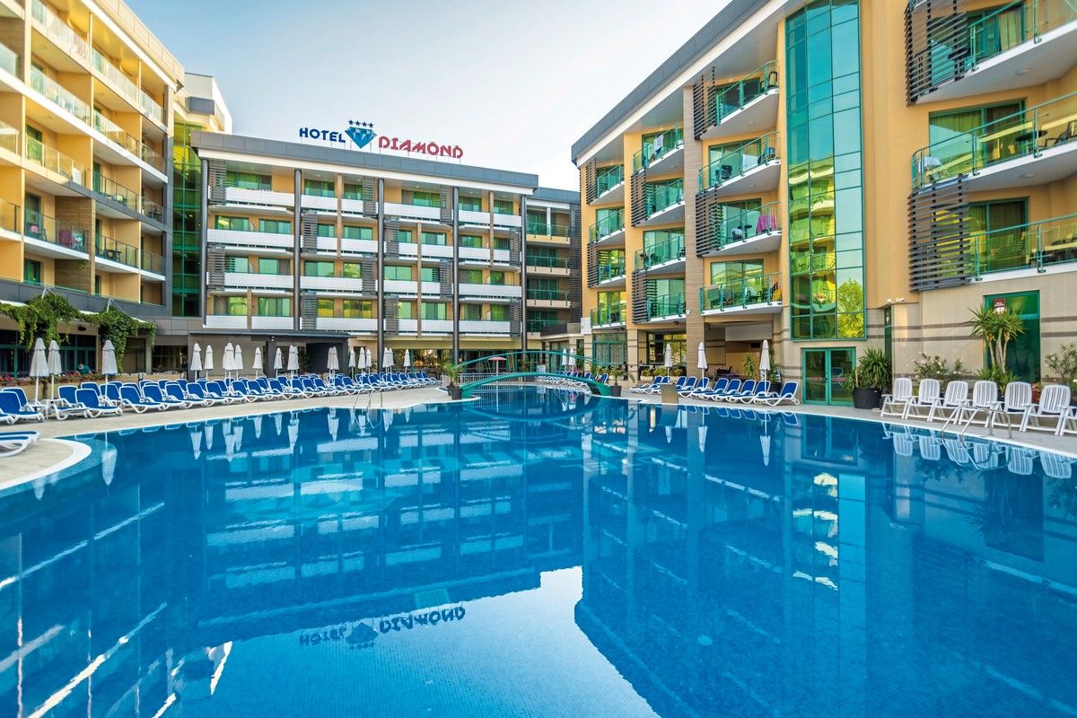 Hotel Dimond se nachází v samém centru letoviska Slunečné pobřeží a jedná se o moderní komplex. Na písečnou pláž s pozvolným vstupem do moře se dostanete přes ulici. Obchody, bary a restaurace se nachází v bezprostřední blízkosti hotelu. Do centra historického Nessebaru, který je vzdálen 5 km, se můžete dostat turistickým vláčkem, který je za poplatek nebo krásnou procházkou podél pobřeží. Tento komplex je vhodný pro všechny věkové kategorie a především pro rodiny s dětmi.