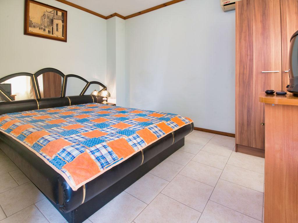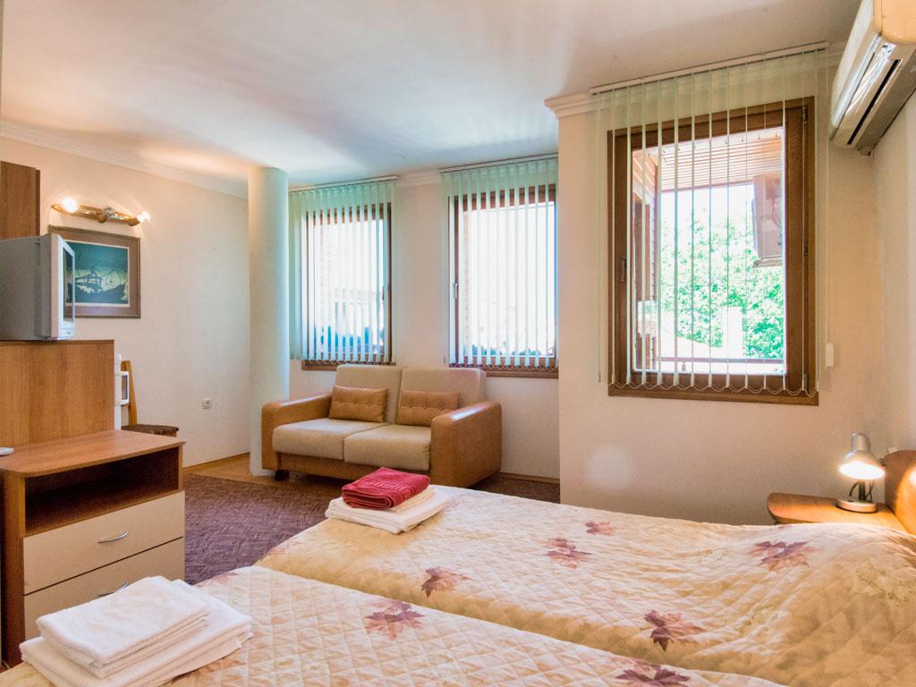 | Pokoje s balkonem a sociálním zařízením (sprcha, WC) jsou klimatizovány (klimatizace zdarma) a vybaveny TV/SAT, Wi-Fi (zdarma) a chladničkou. Možnost jedné přistýlky. Maximální obsazenost tři dospělí. Je zde k dispozici i jeden rodinný pokoj 2+2 (dvě dveřmi oddělené místnosti se společným balkonem a sociálním zařízením - ložnice se dvěma lůžky a denní místnost s rozkládacím gaučem, lze využít jako přistýlku pro dvě osoby). Maximální obsazenost čtyři dospělé osoby. |