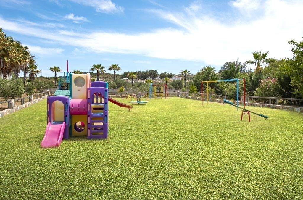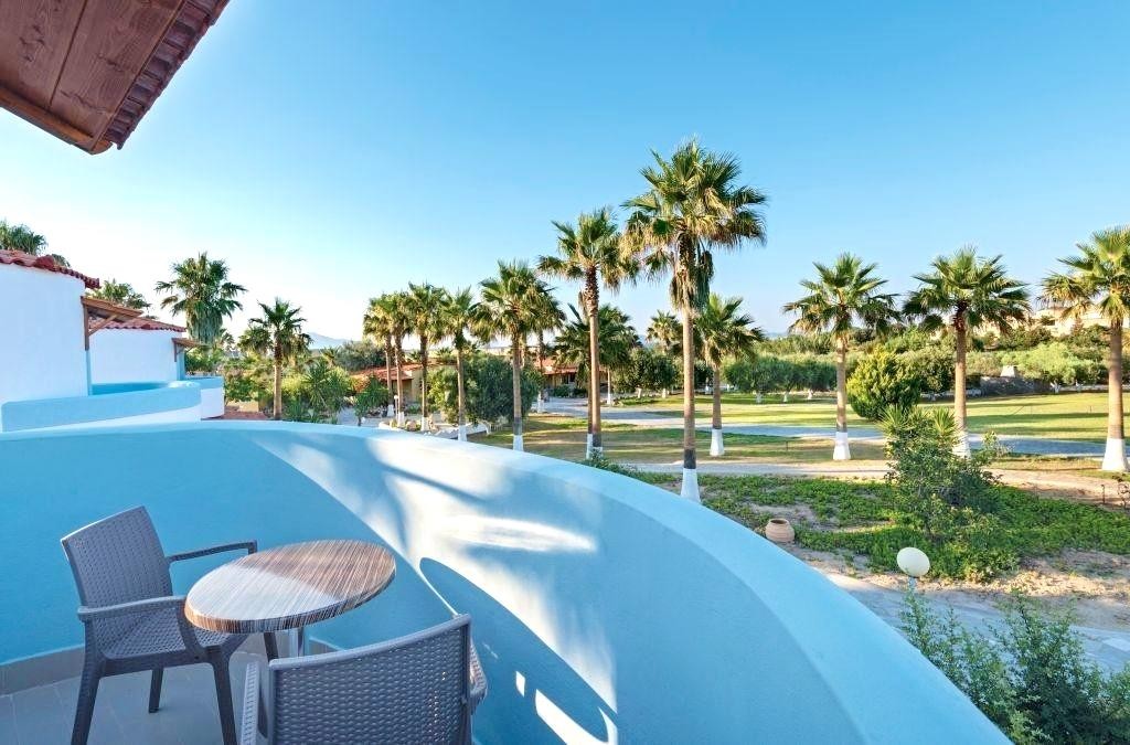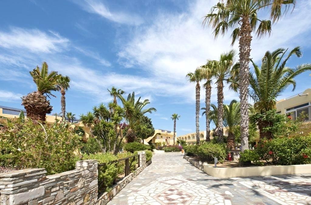 Hotelový komplex v krásné udržované zahradě přímo u dlouhé písečné pláže, 1,5 km od centra letoviska Mastichari s tavernami a obchůdky. Hlavní město Kos 21 km.