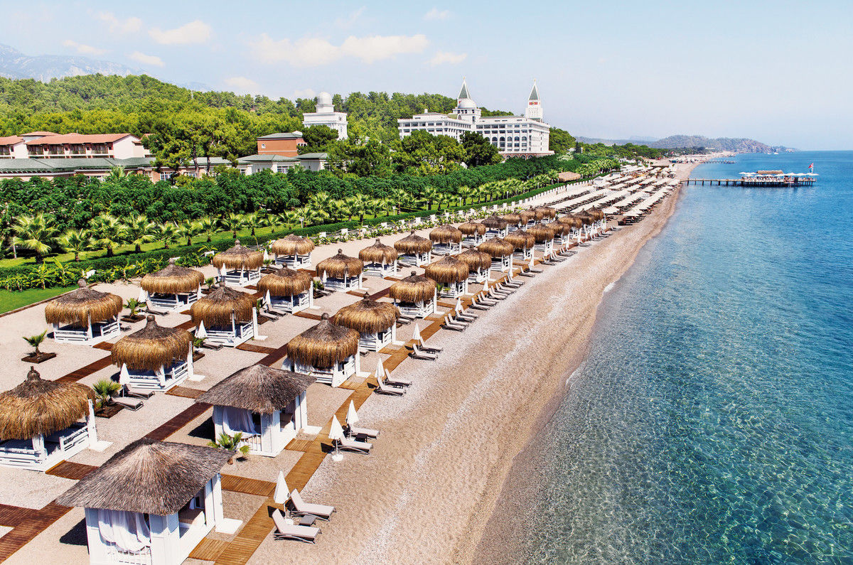 | Rozlehlý hotelový komplex o celkové ploše přes 160 000 m2 tvoří několik ubytovacích bloků a vilek vsazených do udržovaných zahrad se vzrostlou zelení a areál bazénů v přední části, který přechází na širokou pláž s vlastním molem zapuštěným do moře. Uvítá Vás velká elegantní vstupní hala s recepcí, lobby a výtahy. Hotel Vám poskytne veškeré zázemí a plnou vybavenost: společenské a konferenční prostory, salónky a business centrum, dětské prostory, herny, nákupní část, směnárnu, kadeřnictví aj. K relaxaci Vám bude k dispozici Spa a wellness centrum L'Occitane s velkým vnitřním bazénem (437 m2), saunami, hammamem a s nespočtem typů masáží a revitalizačních či kosmetických procedur. Součástí je i profesionálně vybavené fitness centrum. Stravování obstarává hlavní bufetová restaurace s vnitřní i venkovní částí podávající speciality místní turecké i mezinárodní kuchyně, dále celkem 10 tematických a´la carte restaurací se zaměřením na různé typy světové gastronomie, nechybí cukrárny, kavárny a celkem 8 barů (vnitřní i venkovní). Venkovní areál nabízí velký hlavní bazén (4040 m2), samostatný dětský bazén (437 m2) a relaxační bazén (359 m2). Chloubou hotelu je rozlehlý aquapark Pirates of Olympus o celkové rozloze 4000 m2 s 15 skluzavkami a tobogány s oddělenou částí pro dospělé a pro děti. Areál je posetý slunečními terasami s lehátky a slunečníky (v ceně, i na hotelové pláži, pavilónky na molu za poplatek). K aktivnějšímu odpočinku si můžete dopřát tenis, stolní tenis, volejbal, boccia, bowling, minifotbal aj. Hotel pořádá řadu animačních programů pro všechny kategorie hostů (dětský klub, zumba, jóga, aerobic, soutěžní pořady, společenské večery, vystoupení, živá hudba, diskotéky atd). Na pláži můžete využít nabídky střediska vodních sportů. Lze rovněž sjednat pronájem jízdních kol či vozidel. |
