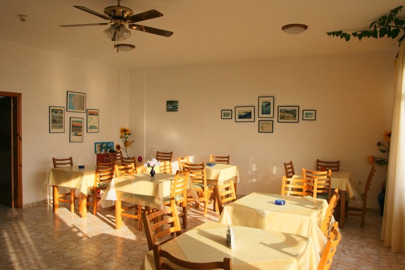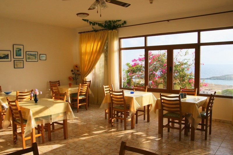 Bez stravování. Možnost dokoupení mírně rozšířených kontinentálních snídaní, které se podávají přímo v ubytování. Majitelka vilky vlastní tavernu Small Paradise v letovisku Lefkos, kde lze dokoupit polopenzi (bez nápojů) - večeři je možné vyměnit za oběd.