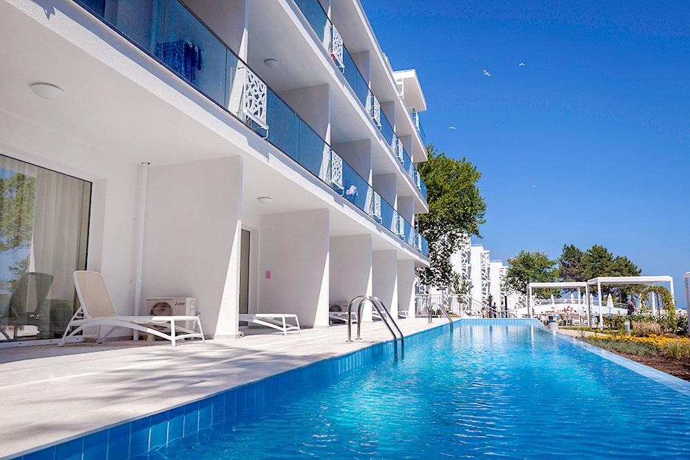 Přímo u dlouhé písečné pláže s pozvolným vstupemHotel vhodný i pro náročné klientyModerní zařízený hotelBazén se skluzavkami pro dětiSPA centrum Senses Spa & Wellness