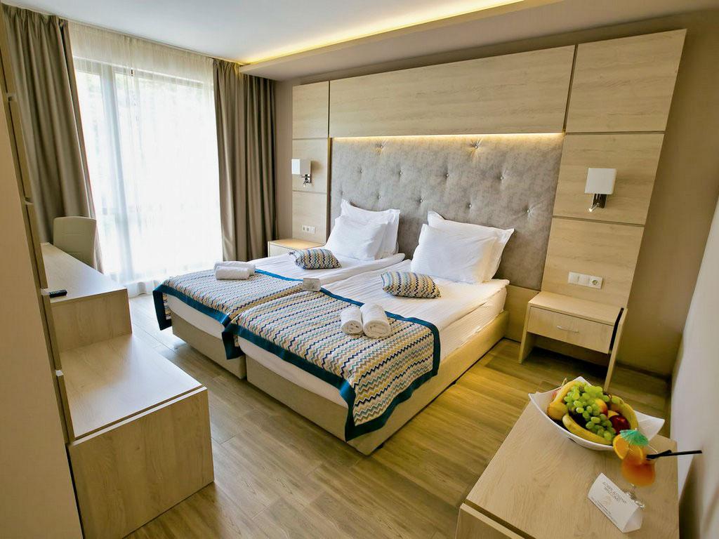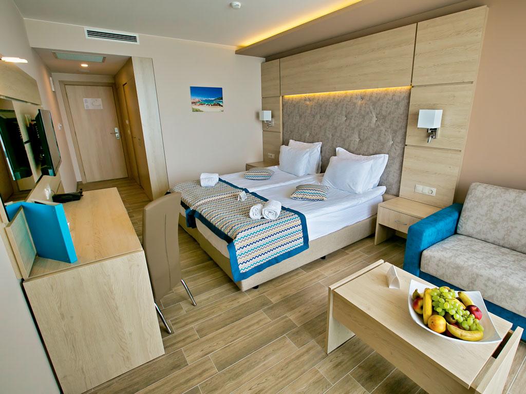 | Elegantní pokoje Deluxe (boční nebo přímý výhled na moře za příplatek) s balkonem a sociálním zařízením (sprchový kout nebo vana, WC, fén) jsou klimatizovány (klimatizace zdarma) a vybaveny TV/SAT, trezorem (zdarma), Wi-Fi (zdarma), telefonem a minibarem (za poplatek). Možnost jedné přistýlky (maximální obsazenost tři dospělí). K dispozici jsou zde i rodinné pokoje (jedna prostornější místnost se třemi pevnými lůžky. Možnost jedné přistýlky, maximální obsazenost čtyři dospělí. |
