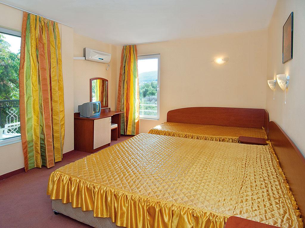 | Pokoje s balkonem a sociálním zařízením (sprcha, WC) jsou klimatizovány (klimatizace zdarma) a vybaveny TV/SAT, Wi-Fi (zdarma) a chladničkou. Možnost jedné přistýlky. Maximální obsazenost dva dospělí a jedno dítě do 10 let. V hotelu jsou k dispozici i třílůžkové pokoje (maximální obsazenost tři dospělí). |