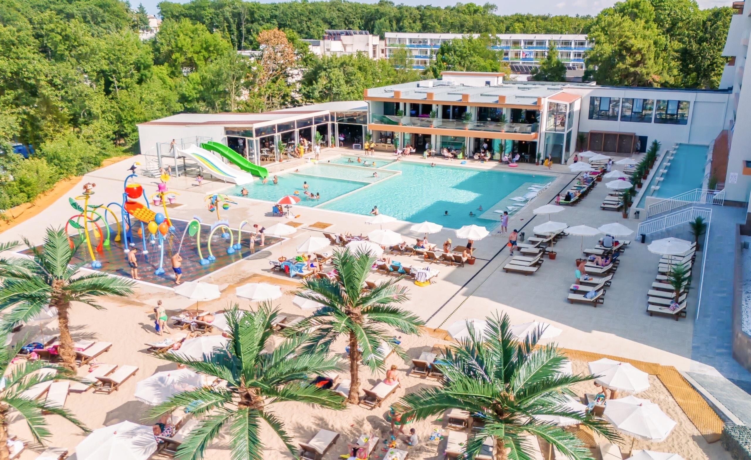 Vstupní hala s recepcí, lobby bar, bar u bazénu, restaurace, bazén s oddělenou dětskou částí, vířivka, skluzavky, splash park, fitness