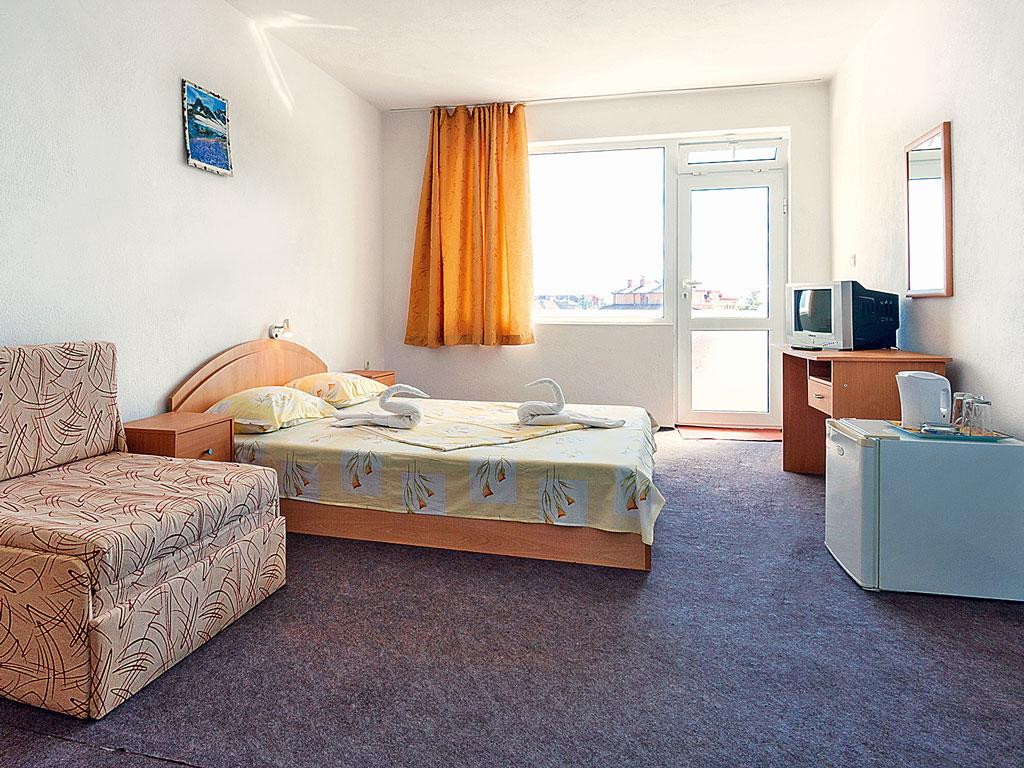 | Pokoje s balkonem a sociálním zařízením (sprcha, WC) jsou vybaveny TV, Wi-Fi (zdarma), chladničkou a varnou konvicí. Možnost jedné přistýlky (pevné lůžko). Maximální obsazenost tři dospělí. |