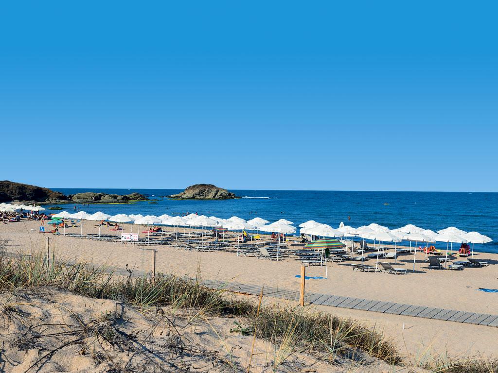 | Pláž je písčitá, prostorná, dlouhá přes jeden kilometr a postupně se svažující do moře. Je vzdálená cca 450 m od penzionu. V letovisku najdete i menší písčité pláže. Slunečníky a lehátka na pláži za poplatek. Na pláži - občerstvení, bary, pronájem vodních šlapadel, vodních lyží, windsurfingu atd., školy vodních sportů (vše za poplatek). |