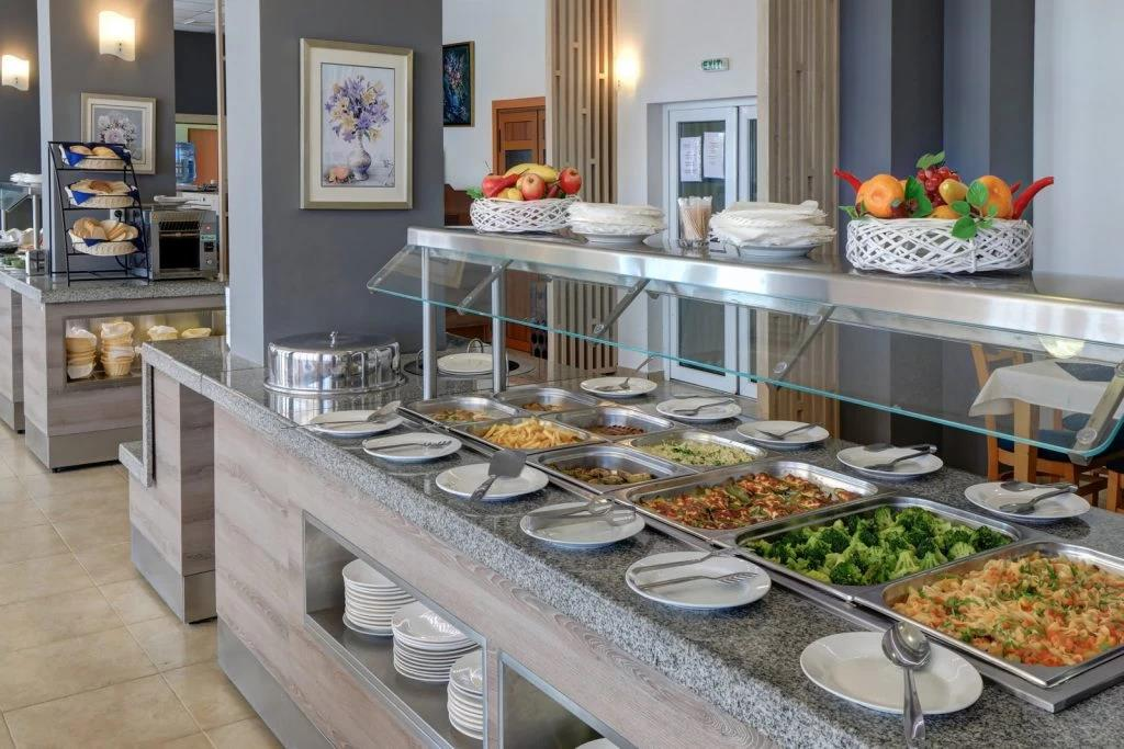 - Hlavní restaurace: 8.00–10.00 snídaně formou bufetu, 10.30-11.00 pozdní snídaně formou bufetu, 12.00–14.00 oběd formou bufetu, 18.30–21.00 večeře formou bufetu, u snídaně káva, čaj a nealkoholické nápoje, u oběda a večeře nealkoholické a vybrané alkoholické nápoje (vše místní výroby, rozlévané), 16.00–17.00 lehké občerstvení, káva, čaj, ovoce, pečivo