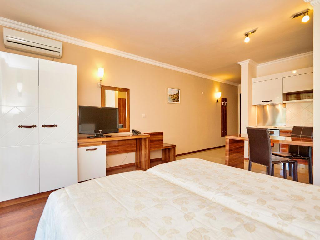 | Pokoje s balkonem a sociálním zařízením (sprchový kout nebo vana, WC, fén) jsou klimatizovány (klimatizace zdarma) a vybaveny TV/SAT, telefonem, Wi-Fi (zdarma) a chladničkou. Možnost dvou přistýlek. Maximální obsazenost dva dospělí a dvě děti. V hotelu jsou k dispozici i studia S 2 (jedna místnost s kuchyňským koutem, maximální obsazenost dva dospělí), studia S 2+2 Lux (jedna místnost s kuchyňským koutem a rozkládacím gaučem, maximální obsazenost tři dospělí nebo dva dospělí a dvě děti) a apartmány A 2+2 (dvě místnosti - ložnice a obývací pokoj s kuchyňským koutem a rozkládacím gaučem, maximální obsazenost tři dospělí nebo dva dospělí a dvě děti). Klimatizované (klimatizace zdarma) apartmány a studia s balkonem a sociálním zařízením (sprchový kout nebo vana, WC, fén) jsou vybaveny TV/SAT, telefonem a Wi-Fi (zdarma). Kuchyňský kout je zařízen varnou deskou, kuchyňskou linkou se základním vybavením, chladničkou, pračkou, mikrovlnnou troubou a varnou konvicí. |