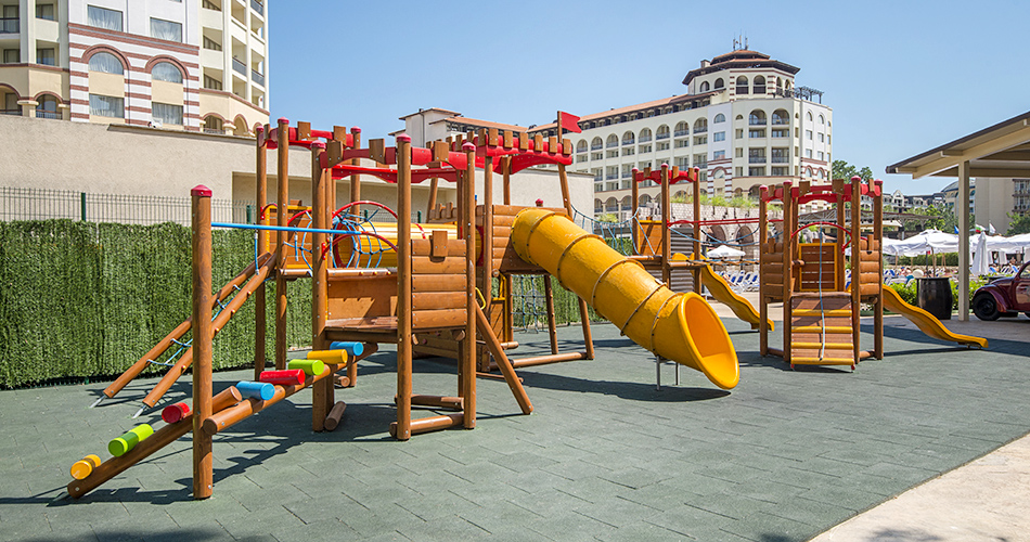 Vstupní haly s recepcí (budova A, B, C), celkem 13 výtahů, směnárny, 3 hlavní restaurace (v hlavní sezoně), 2 tématické restaurace (Indická a Čínská) 5 dní v týdnu formou bufetu (červenec-srpen), pivní bar Biergarten (červenec-srpen), 3 lobby bary (v hlavní sezoně), snack bar u bazénu, kavárna (červenec-srpen), bar na pláži (zač.června-pol.září), 2 konferenční místnosti, animační sál, WiFi ve společných prostorách a na pokojích zdarma, 3 bazény, 3 dětské bazény, miniaquapark s tobogány pro děti (min. výška 120 cm, 1.6.-15.9., v časech určený hotelem) i dospělé; lehátka a slunečníky u bazénu zdarma (1.6.-15.9.); parkoviště (20BGN//místo/den), minimarket, kadeřnictví.