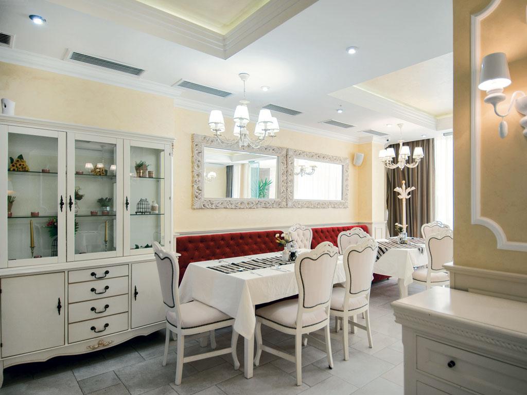 | Služby all inclusive zahrnují plnou penzi formou bufetu (snídaně v době od 07:30 do 10:00 h, obědy v době od 12:00 do 14:00 h, večeře v době od 18:00 do 21:00 h), dopolední (v době od 10:30 do 11:00 h), odpolední (v době od 14:30 do 16:00 h) a pozdní odpolední (v době od 16:00 do 17:00 h) občerstvení na terase restaurace, neomezenou konzumaci vybraných místních alkoholických (destiláty obvykle podávané v míře 50 ml) a nealkoholických nápojů v barech v době od 09:00 do 23:00 h. Uvedené časy jsou orientační. |
