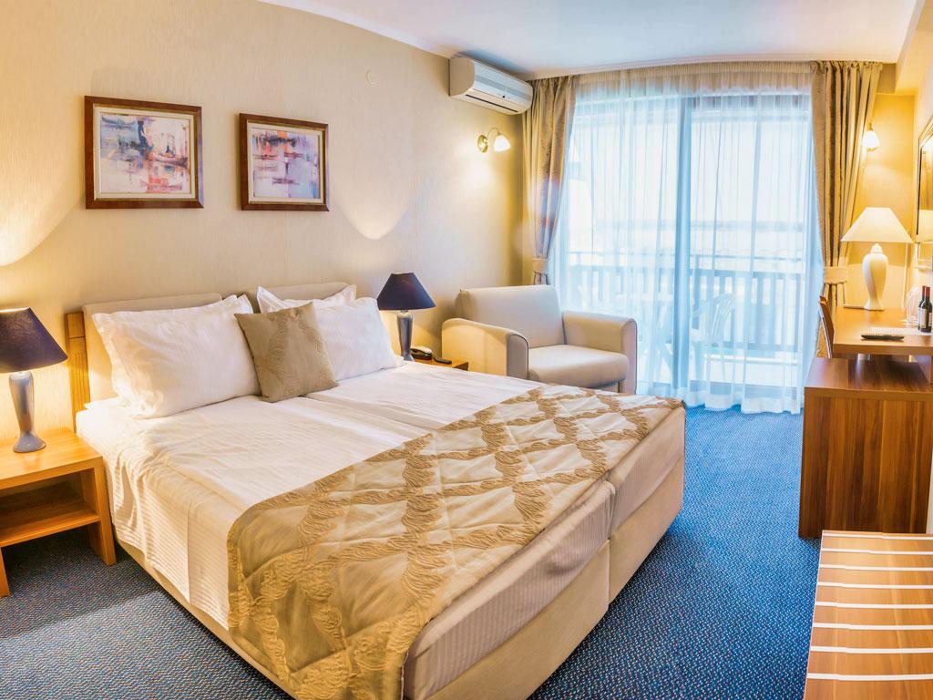 | Pokoje (typ A má velikost 21 m2, typ B - 18 m2 a typ C - 15 m2) s balkonem s výhledem na mořskou stranu a sociálním zařízením (vana, WC, fén) jsou klimatizovány (klimatizace zdarma) a vybaveny TV/SAT, Wi-Fi (zdarma), přípojkou na internet (zdarma), trezorem (zdarma), telefonem a chladničkou. Možnost jedné přistýlky. Maximální obsazenost tři dospělí. |
