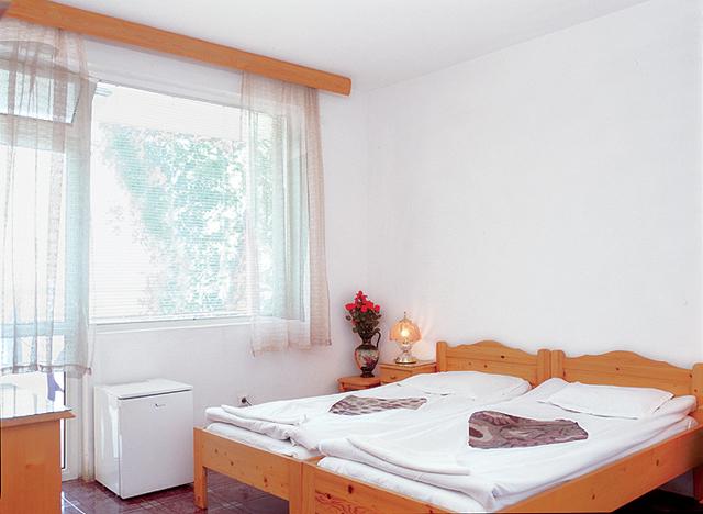 | Prostorné pokoje s balkonem, výhledem na moře a sociálním zařízením (sprcha, WC) jsou klimatizovány (klimatizace zdarma) a vybaveny starším dřevěným nábytkem a chladničkou. Možnost jedné přistýlky. |
