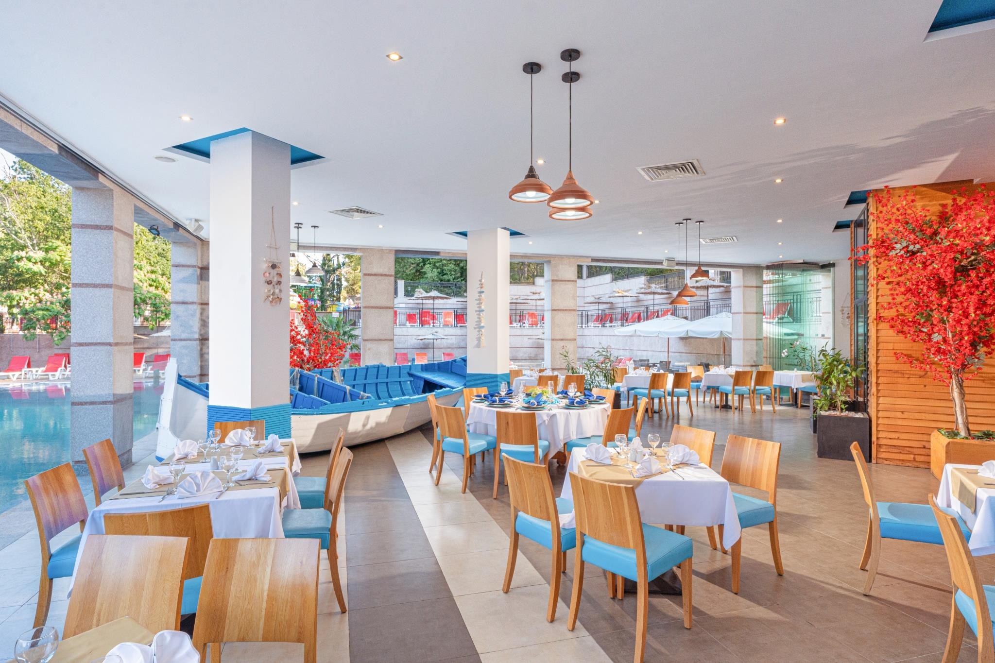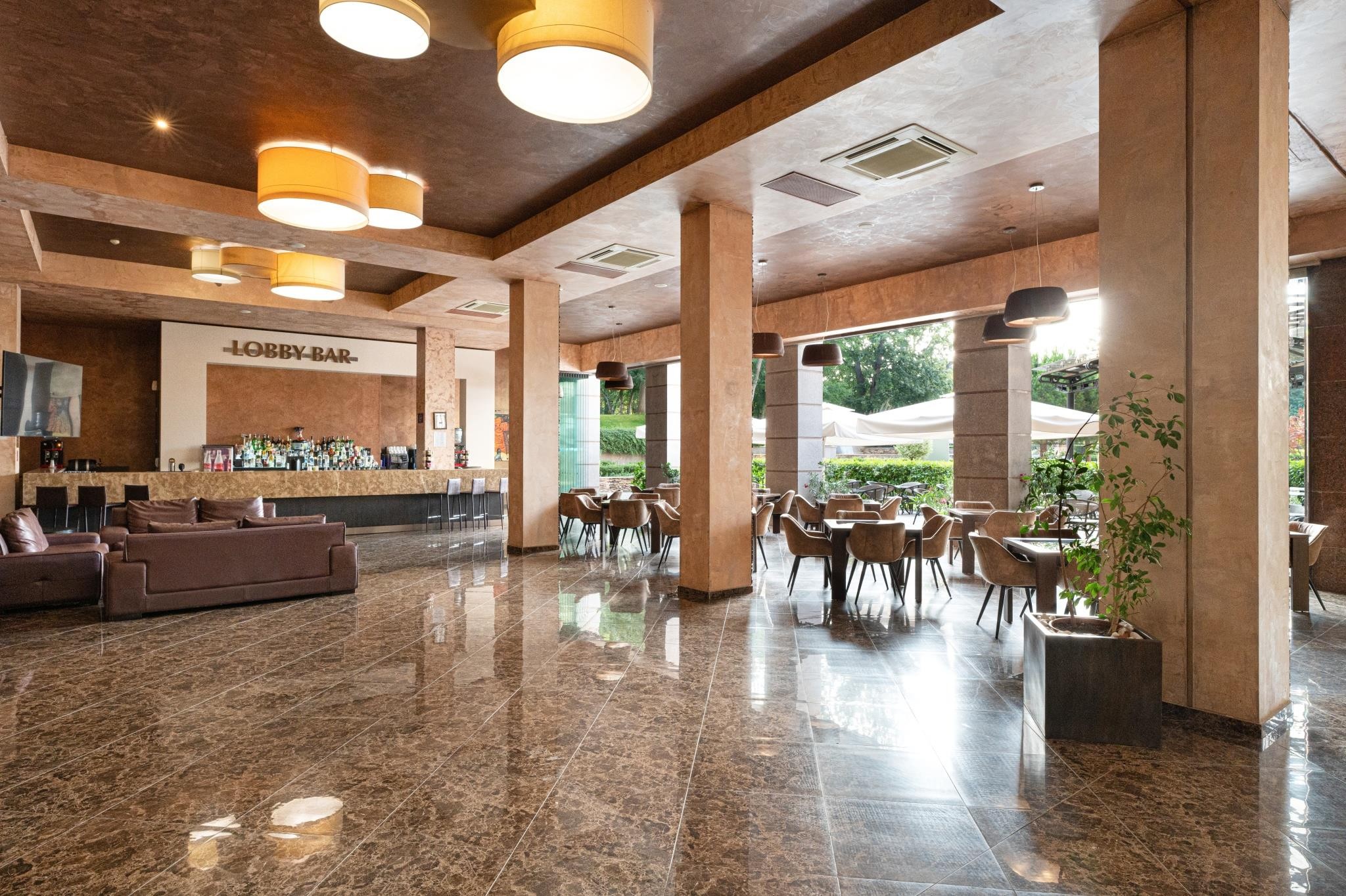 Vstupní hala s recepcí, výtahy, směnárna, restaurace, 2 tematické restaurace, lobby bar, kavárna, bar u bazénu, konferenční sál, obchůdky. V zahradě 2 bazény, bar u bazénu, terasy s lehátky, slunečníky a osuškami zdarma (vratná záloha).