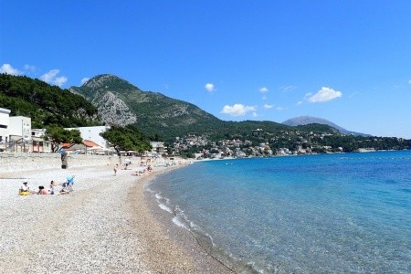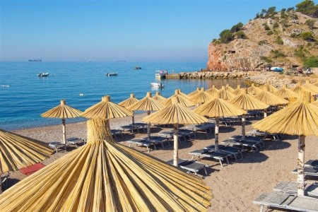Soukromá písečná pláž s lehátky a slunečníky je vzdálena jen 30