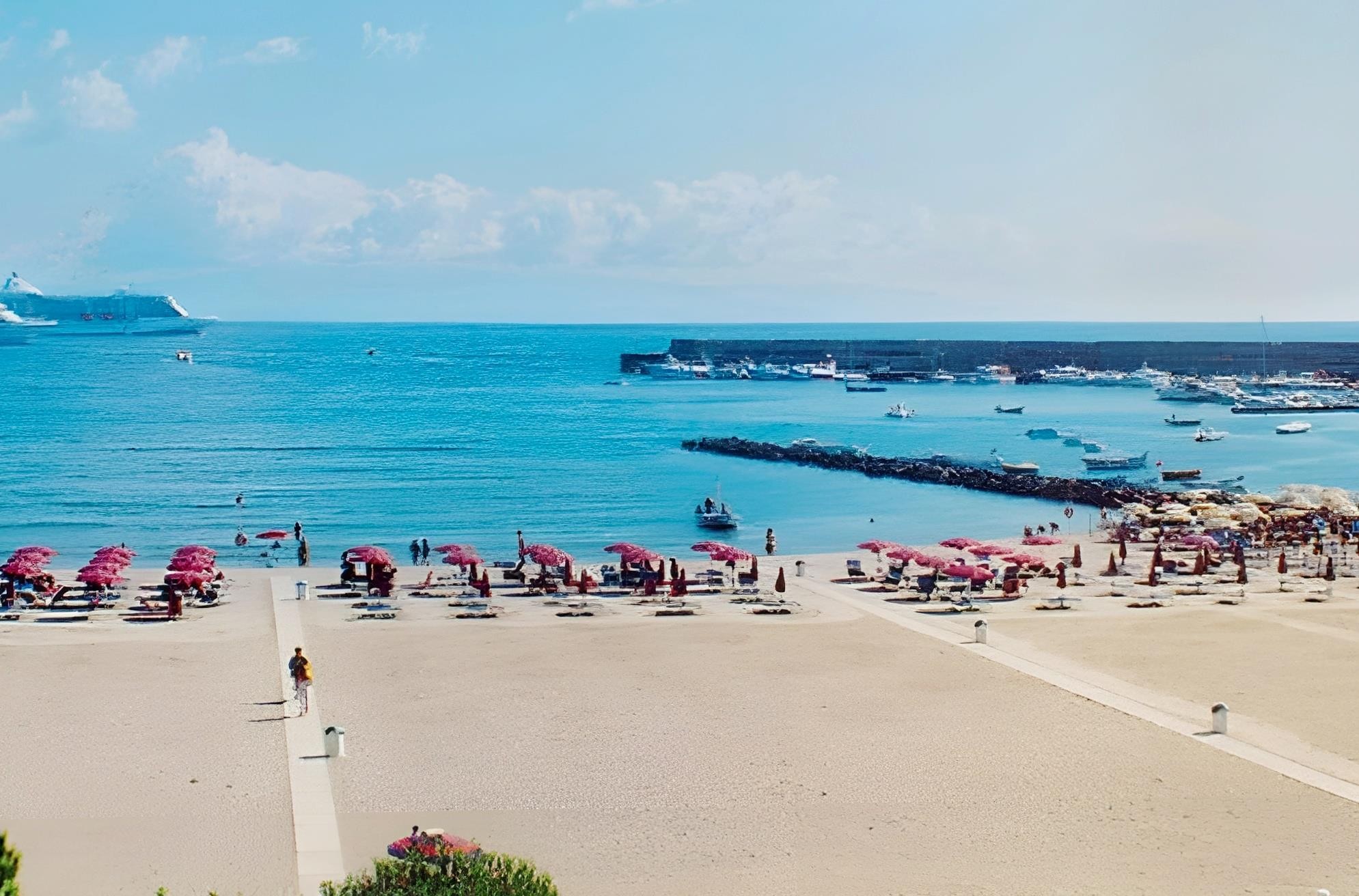 Hotel od pláže s hrubším pískem oddělen pouze místní komunikací, lehátka a slunečníky za poplatek.