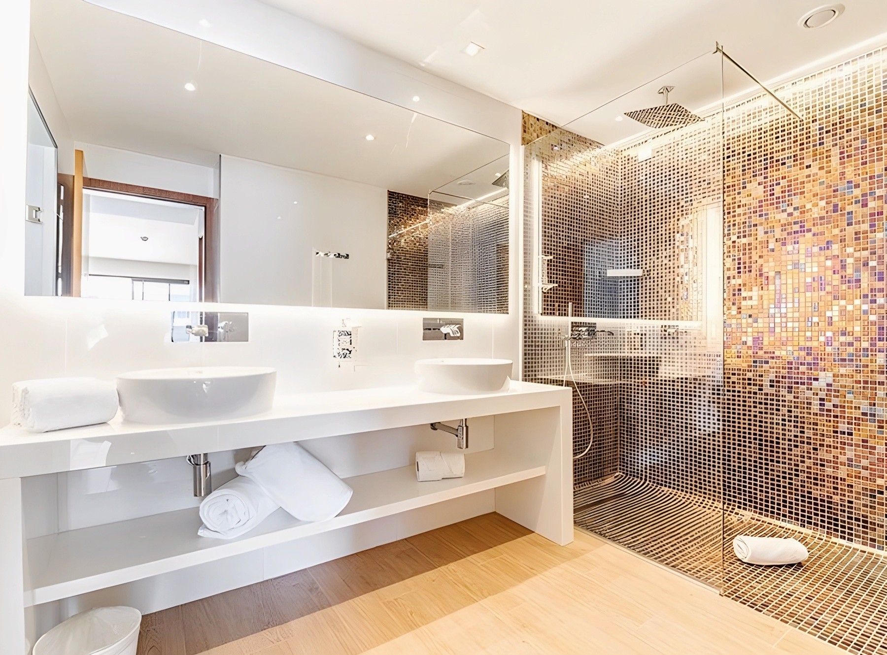 - Junior suite s výhledem do zahrady nebo na bazén: Junior Suity jsou prostornější (cca 43 m²), pohovka