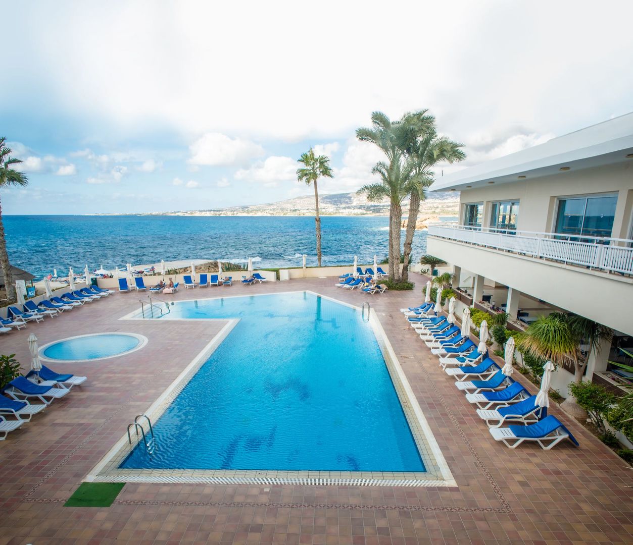 Hotel na skalnatém výběžku nad mořem v klidném prostředí cca 7 km od centra Paphosu (možnost spojení linkovým autobusem), letiště Larnaca cca 140 km.