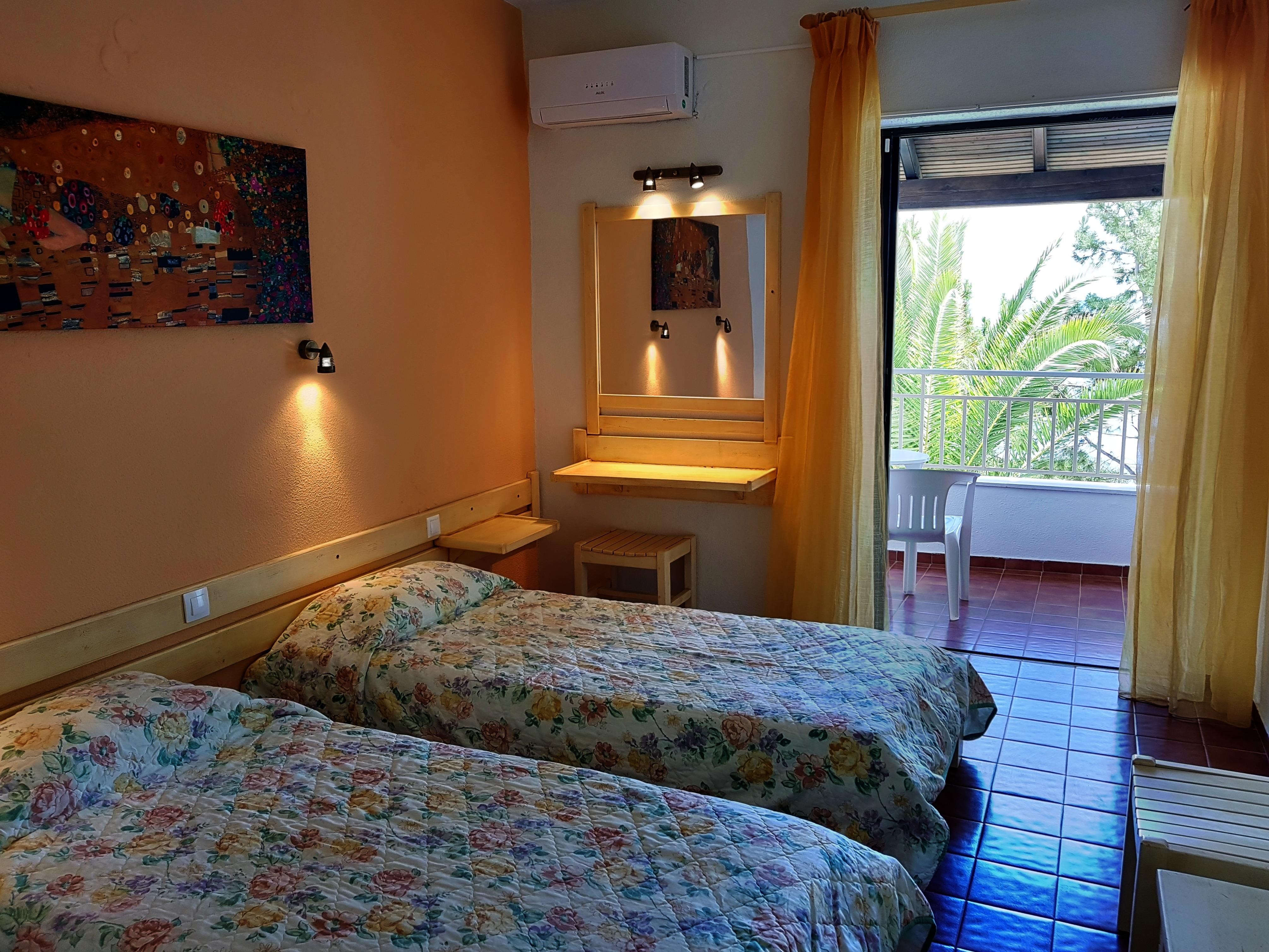 Dvoulůžkový pokoj: koupelna/WC, TV/sat., telefon, lednička, trezor a klimatizace za poplatek (na vyžádání), balkon nebo terasa, cca 15m2.