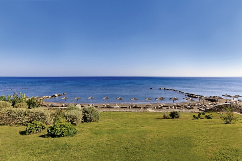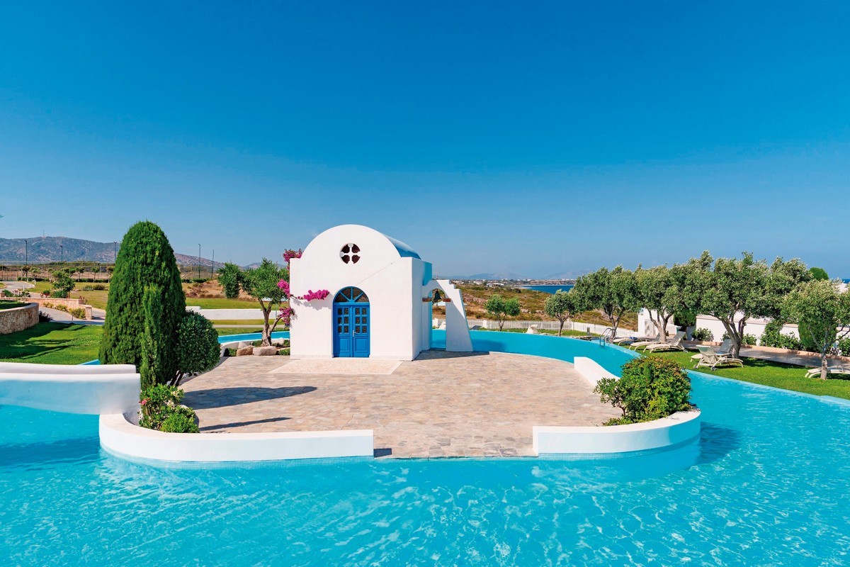 Hlavní budova, bungalovy a vily ve stylu řecké vesnice, vstupní hala s recepcí a hlavní restaurace s otevřenou terasou, restaurace à la carte a restaurace u bazénu. Velký sladkovodní bazén (2000 m2), relaxační bazén s ostrůvkem a malou kapličkou pro svatební obřady, terasy na slunění s lehátky a slunečníky zdarma včetně osušek. Vnitřní bazén ve Spa centru s mořskou vodou.