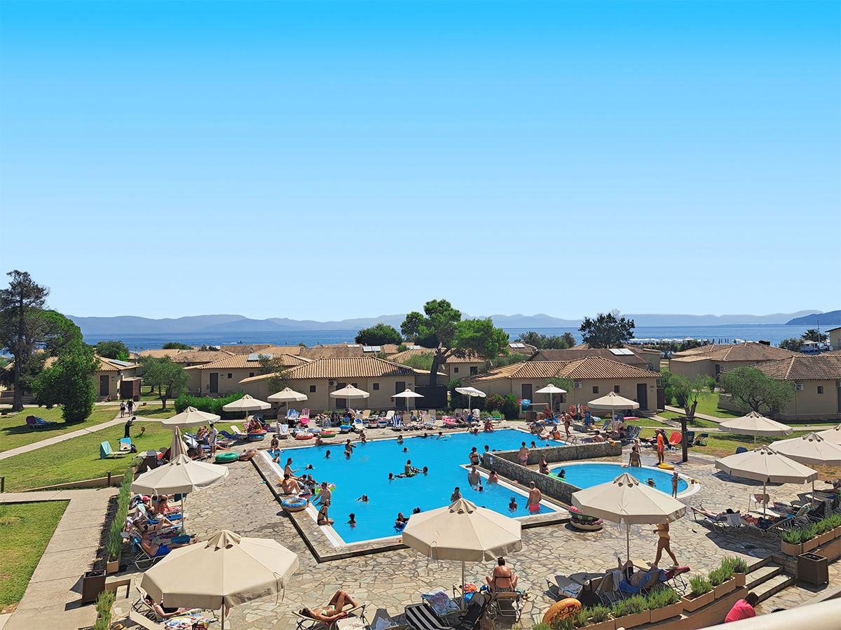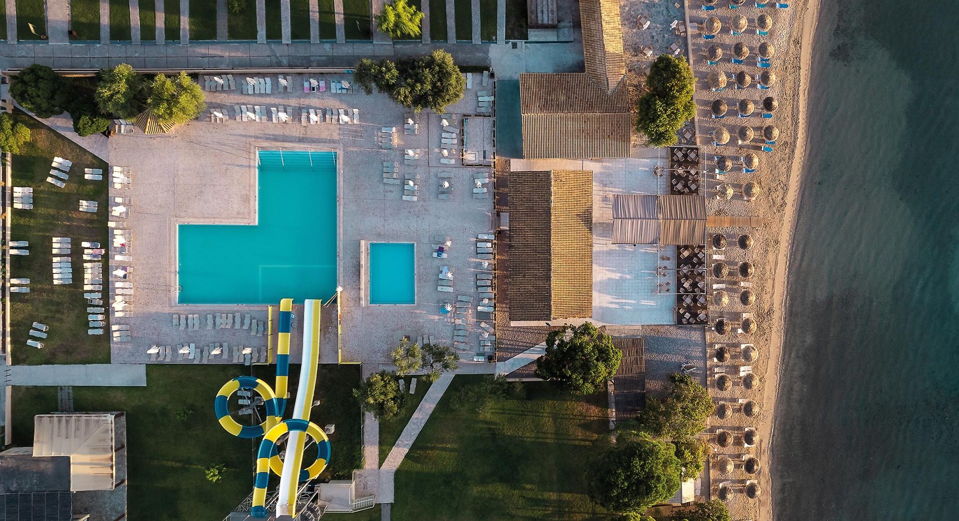 | Aquapark || Animace v češtině od 10.6. do 15.9. || Dětský klub v češtině od 10.6. do 15.9. || Přímo u písčitooblázkové pláže || Slunečníky a lehátka na pláži zdarma || Kvalitní služby || Bohaté zázemí |