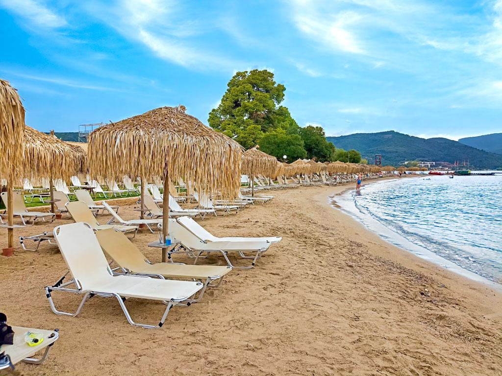 | Písčitooblázková pláž s pozvolným vstupem do moře se nachází přímo u hotelu. SLUNEČNÍKY, LEHÁTKA A OSUŠKY NA PLÁŽI ZDARMA. Vodní sporty za poplatek. |