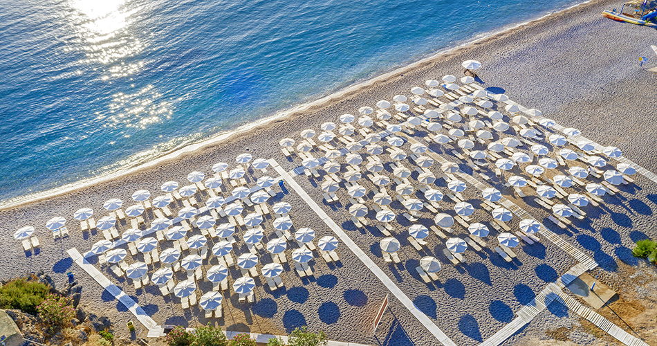 Písčito-oblázková pláž se nachází přímo u hotelu.