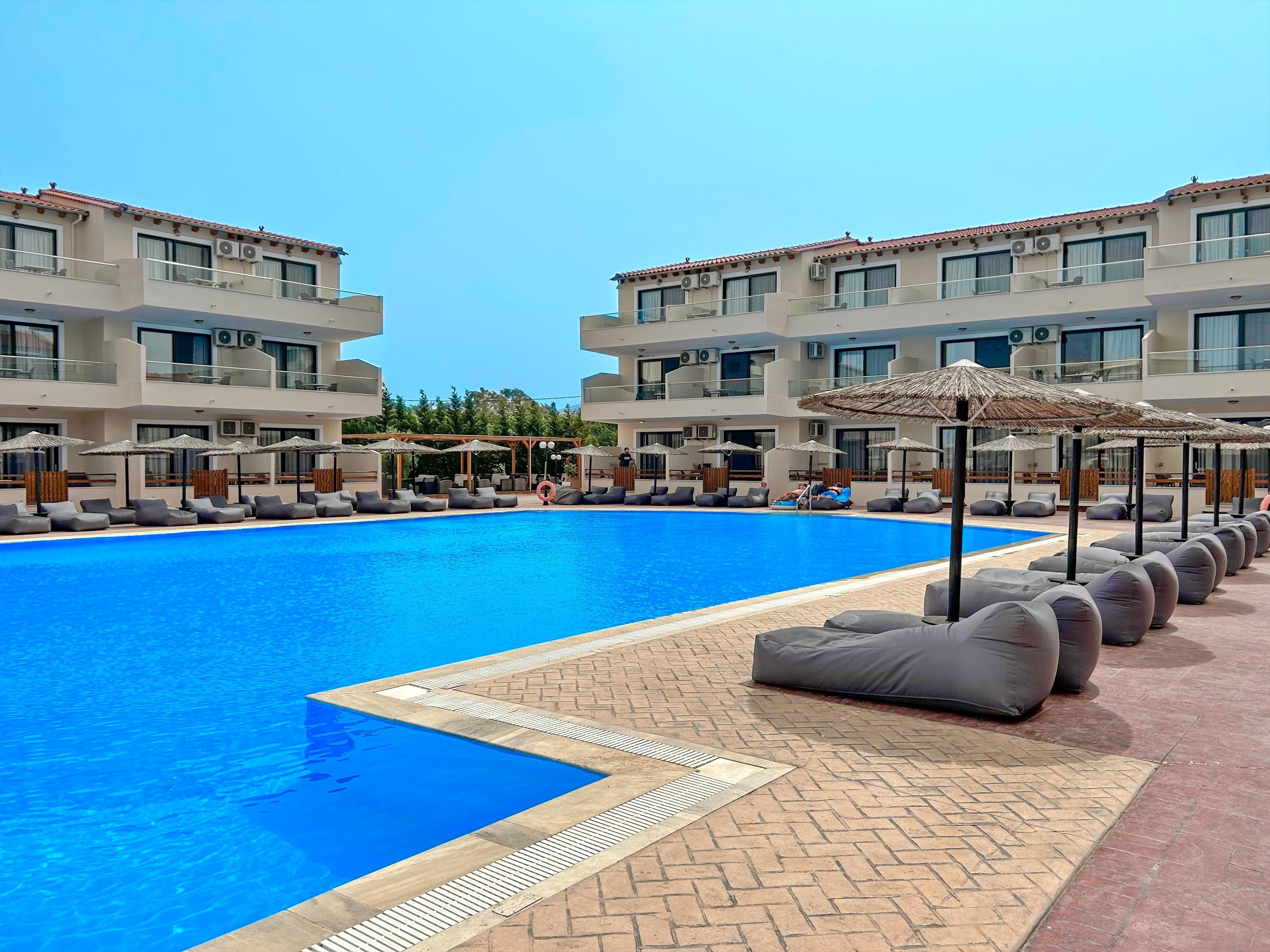 Rodinný hotel s příjemnou atmosférou se skládá z několika budov a leží přímo u přírodní pláže s hrubým pískem. K návštěvě vesničky Roda s příjemnými tavernami, která je od hotelu vzdálena asi 3 kilometry, lze využít hotelovou dopravu ve dnech a hodinách určených hotelem. Hotel doporučujeme klientům, kteří vyhledávají klidnou dovolenou, stejně tak jako rodinám s dětmi.