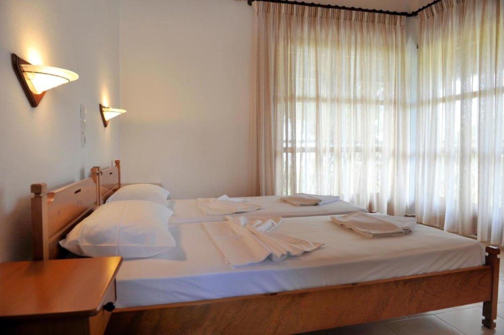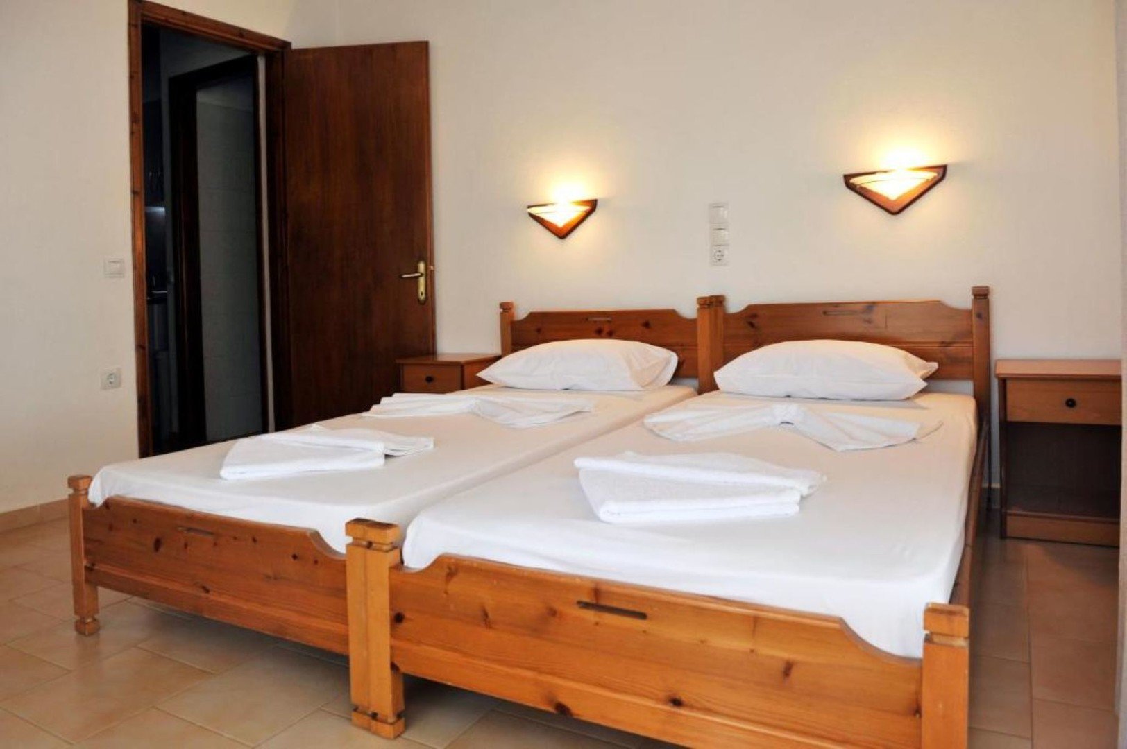 Studia a apartmány jsou vybaveny jednoduše, manželskou postelí nebo dvěma samostatnými lůžky, koupelnou se sprchou, menším kuchyňským koutem.