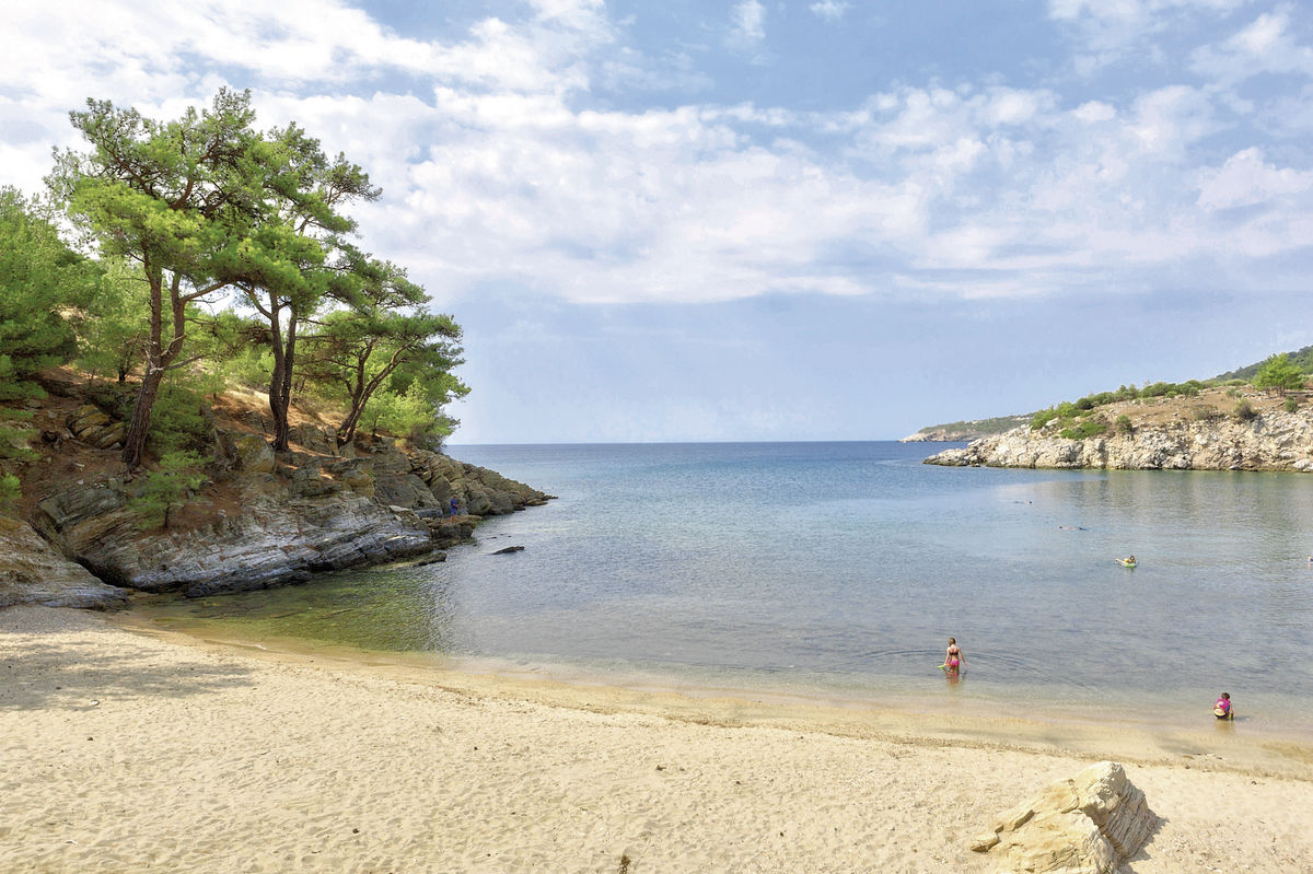 Písčito-oblázková pláž Agios Ioannis přímo u hotelu. Pozvolný vstup do moře. Lehátka, slunečníky a osušky zdarma.
