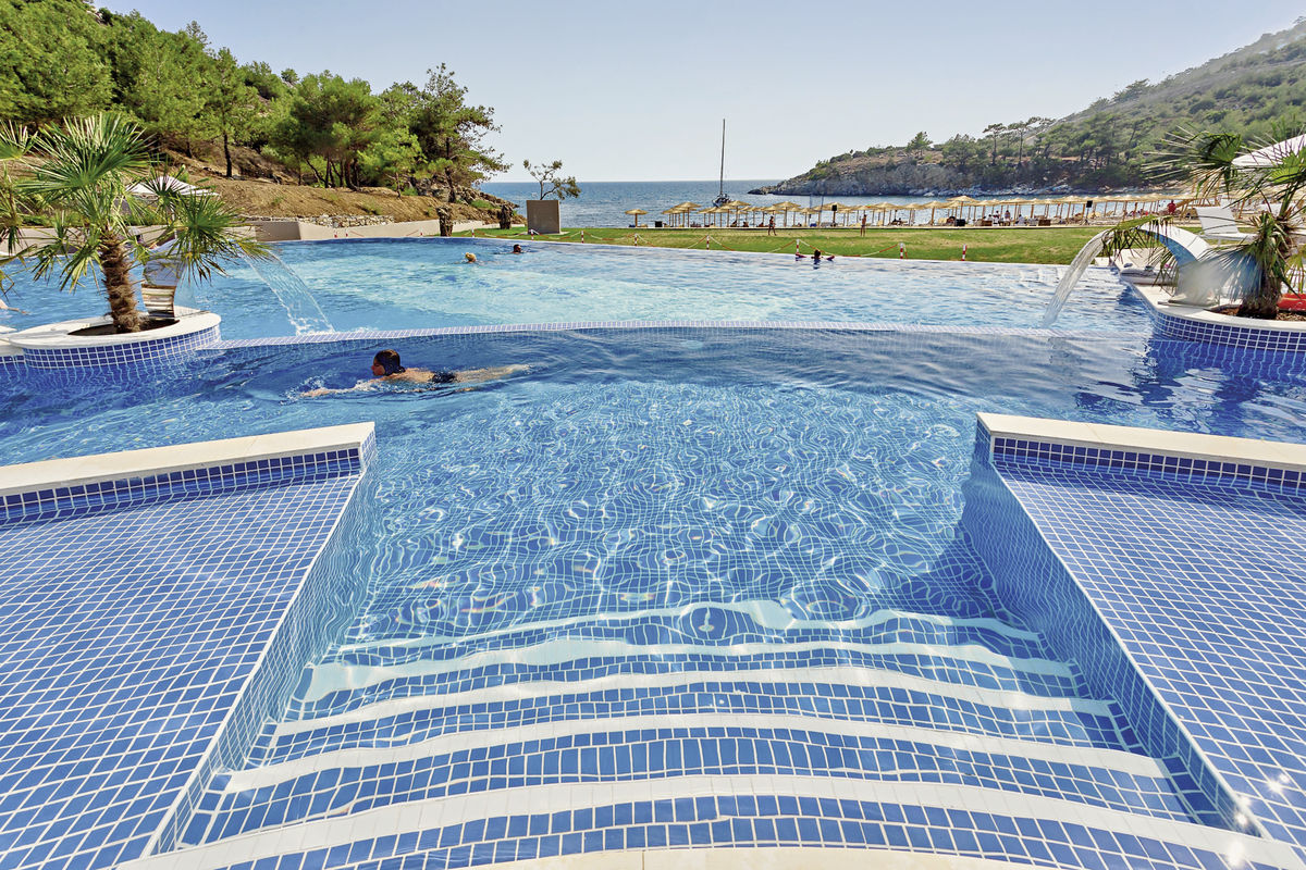 14 budov umístěných terasovitě na kopci, vstupní hala s recepcí, minimarket, hlavní restaurace, á la carte restaurace (v hlavní sezóně), 2 bary (v lobby, na pláži), WiFi v areálu zdarma, bazén, dětský bazén; lehátka, slunečníky a osušky zdarma.