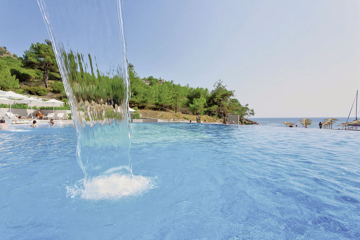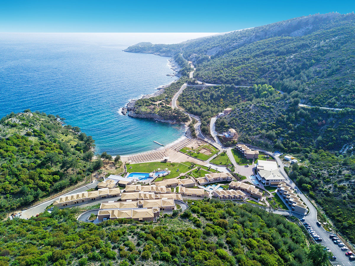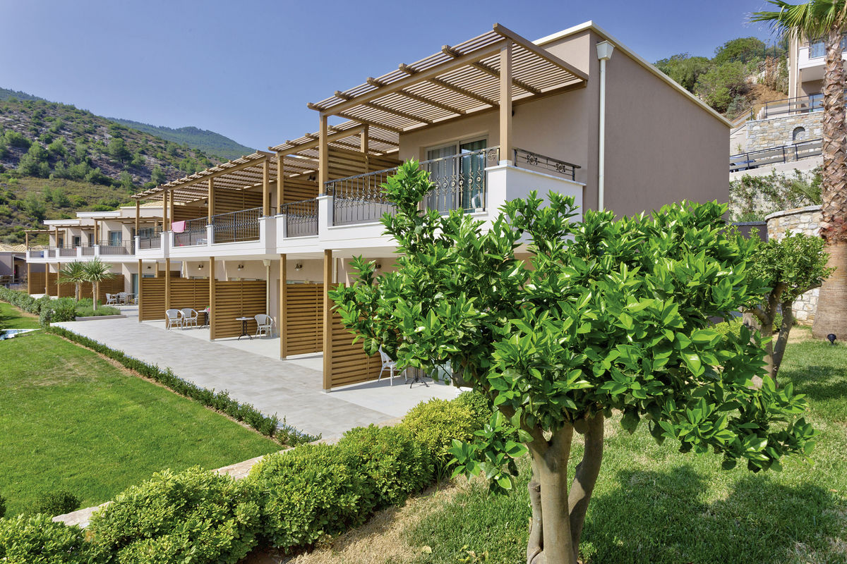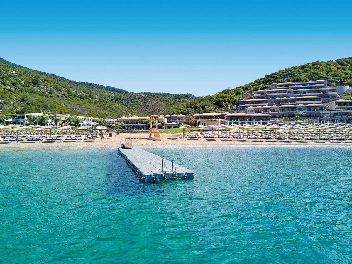 Luxusní resort je vystavěn v kopci u zálivu s písčito-oblázkovou pláží. Příjemné letovisko Skala Potamia je od hotelu vzdálené cca 20 km. Letiště v Kavale je vzdálené cca 50 km.