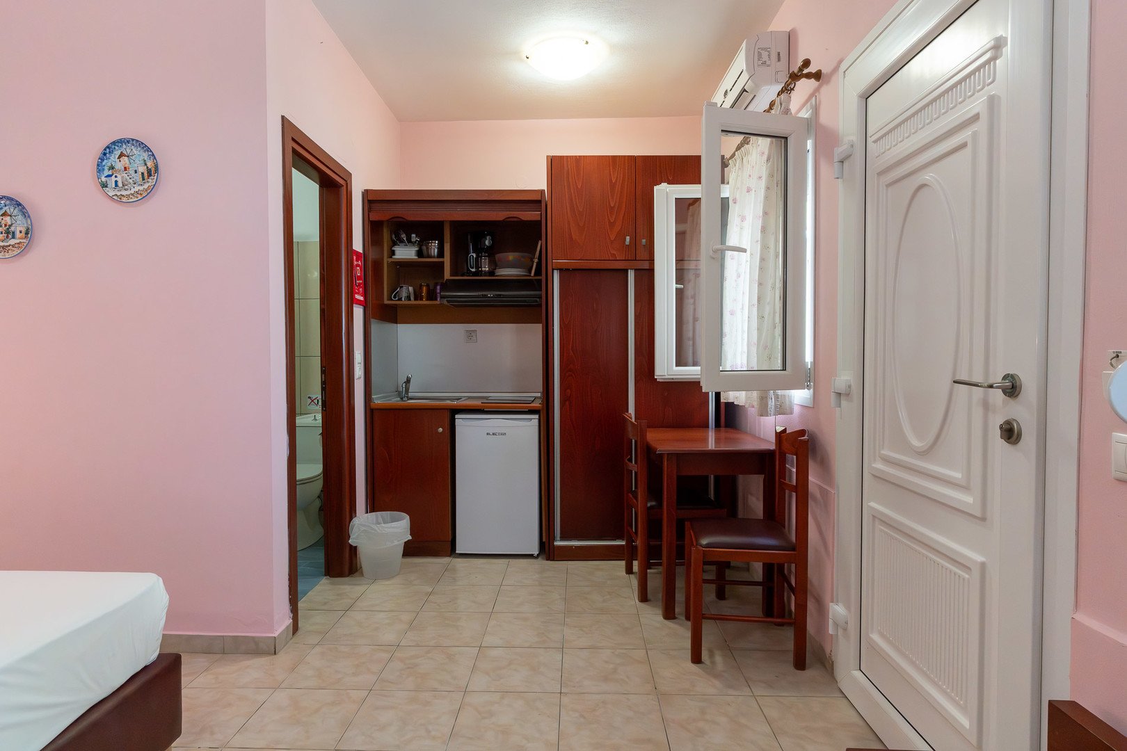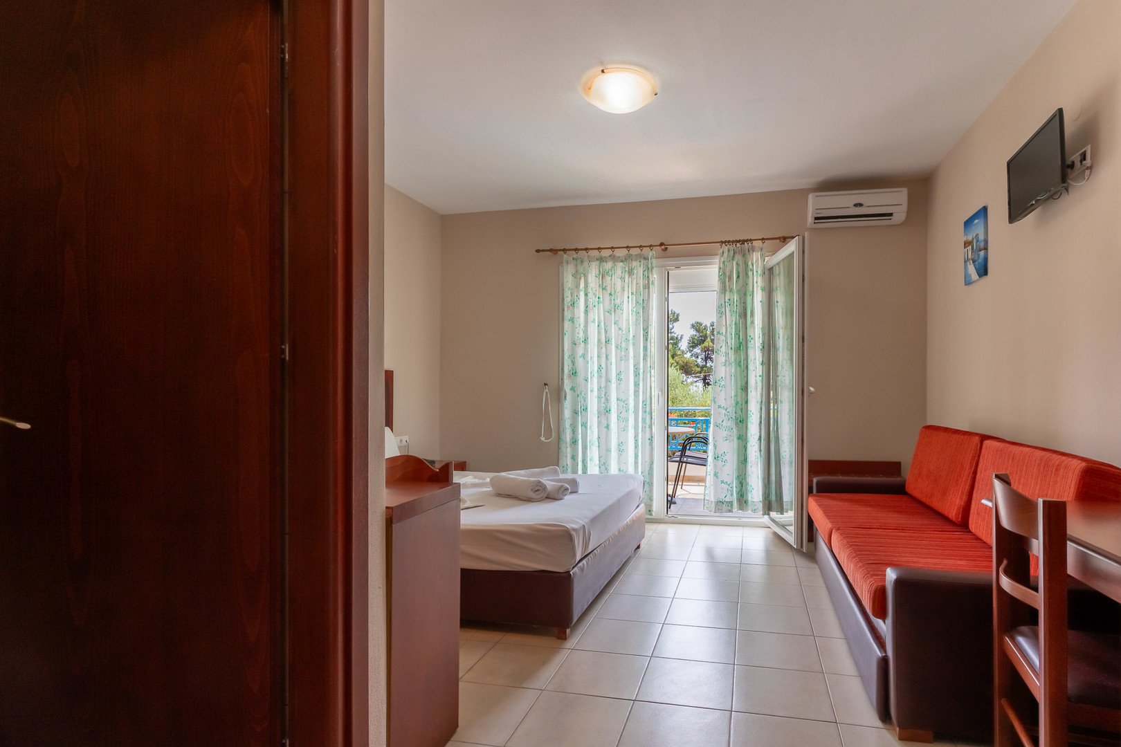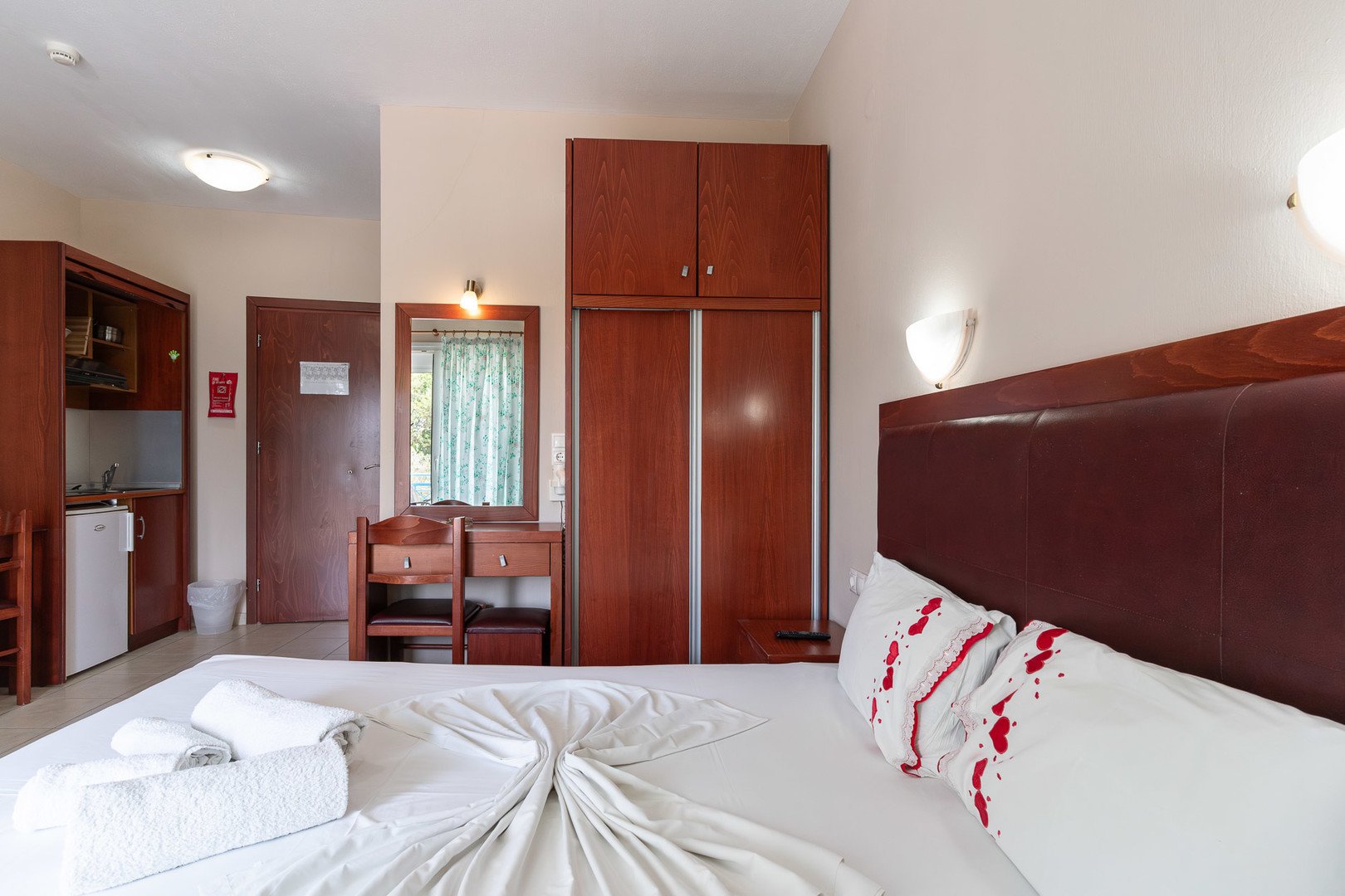 Dvoulůžkové pokoje studiového typu s možností jedné přistýlky jsou vybaveny vlastním sociálním zařízením (WC, sprcha, fén), klimatizace, WiFi, chladnička, SAT/TV, balkon nebo terasa, kuchyňské vybavení.