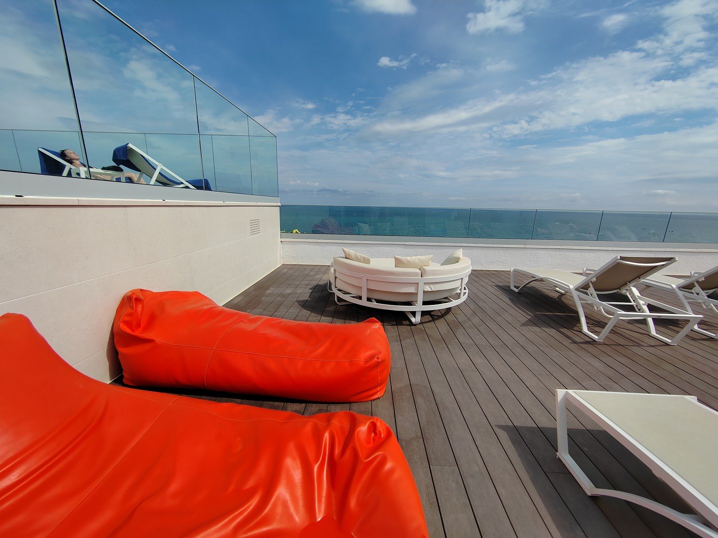 Dlouhá pláž s hrubozrnným pískem a stupňovitým vstupem do moře se nachází cca 150 m od hotelu, přístup podchodem pod lokální tratí, lehátka a slunečníky za poplateklehátka a slunečníky za poplatek (cca 24 EUR/den).