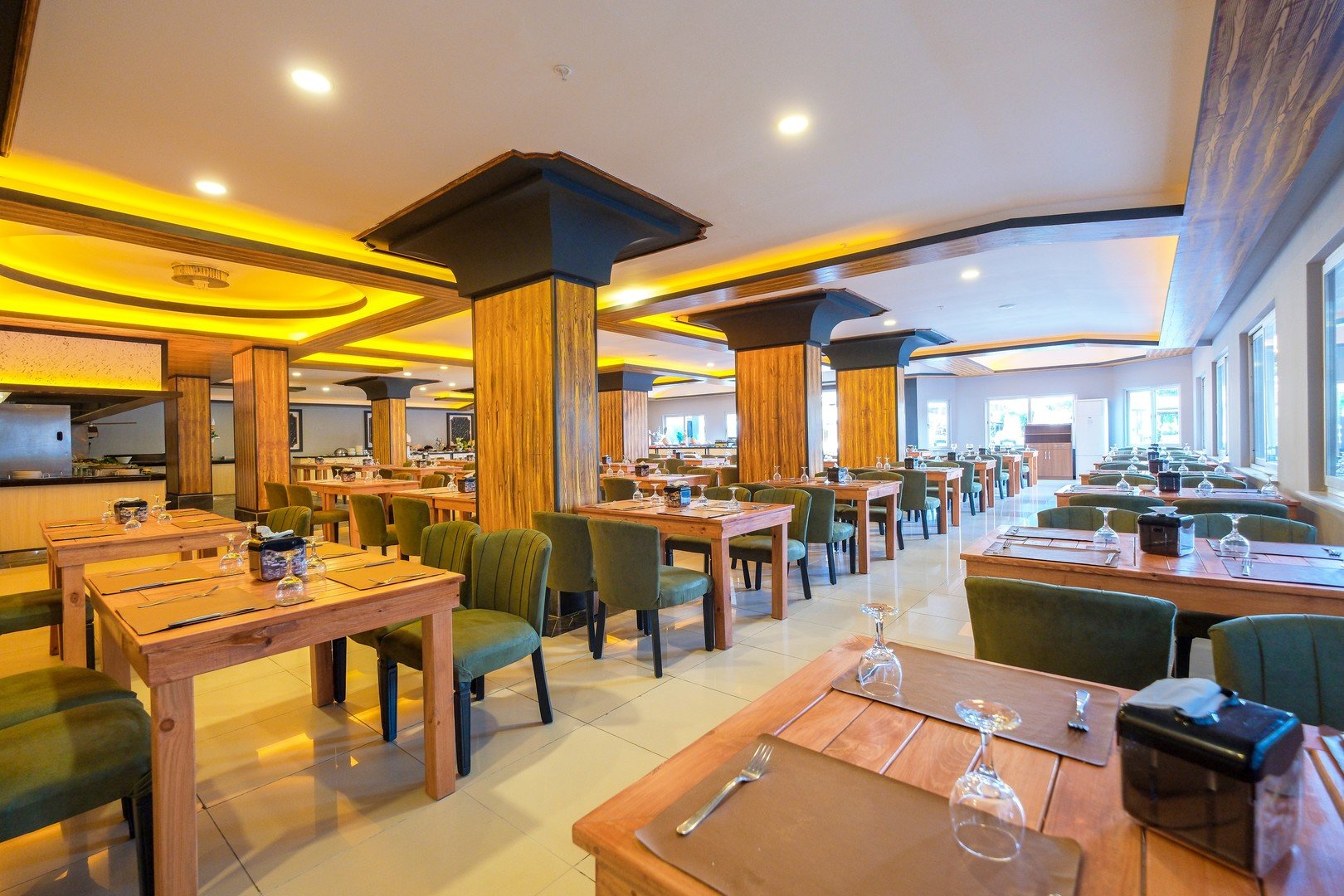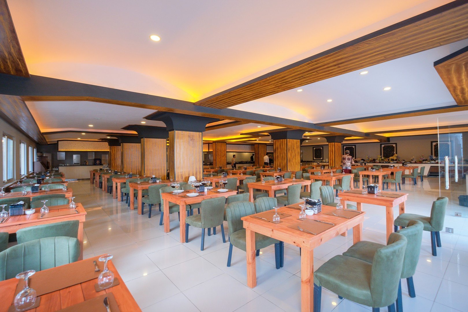 All inclusive (do 22:00) zahrnuje snídaně (7:00-10:00), obědy (12:30-14:00), večeře (19:00-21:00) formou bufetu v hlavní restauraci, pozdní snídaně, odpolední občerstvení, zákusky, káva, čaj, noční občerstvení, nealkoholické nápoje, místní a alkoholické nápoje v časech a místech určených hotelem. Je vyžadováno nošení pásek all inclusive.