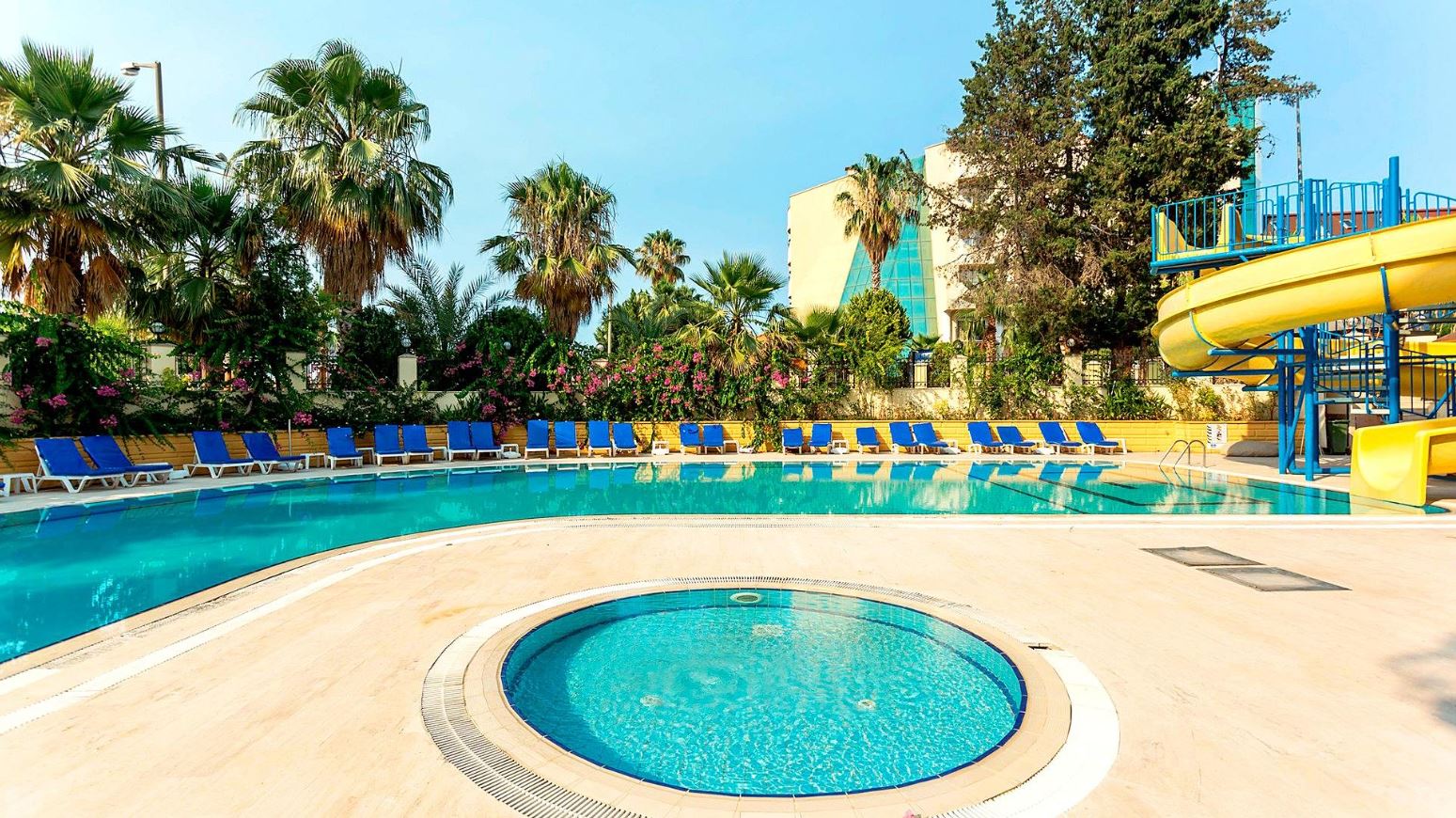 slunečníky a lehátka u bazénů zdarma, ručníky za poplatek