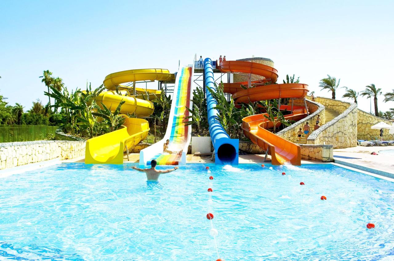 hotelu je aquapark se skluzavkami.